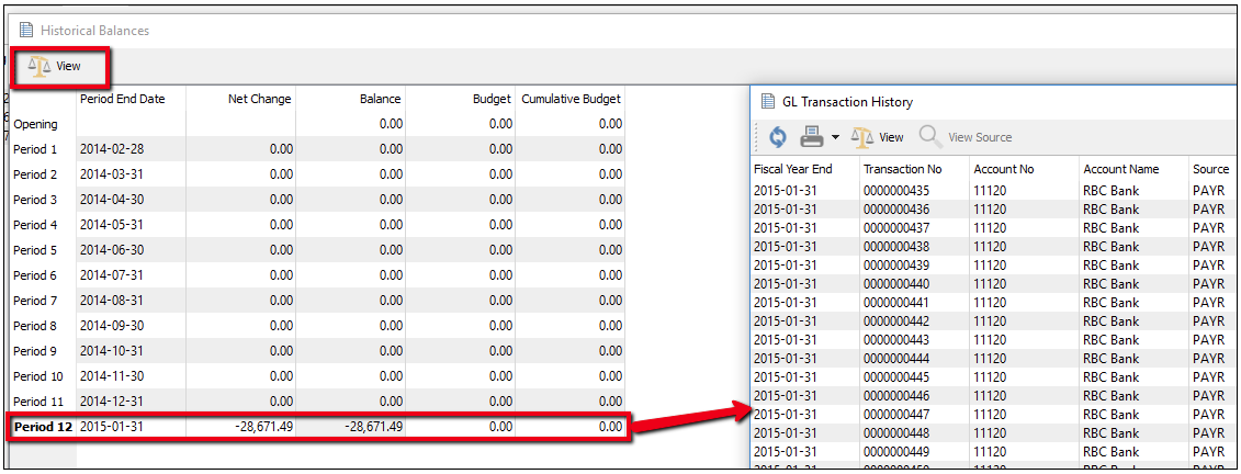 - Select a period and click "View" (or simply double-click the period) to view its transactions: